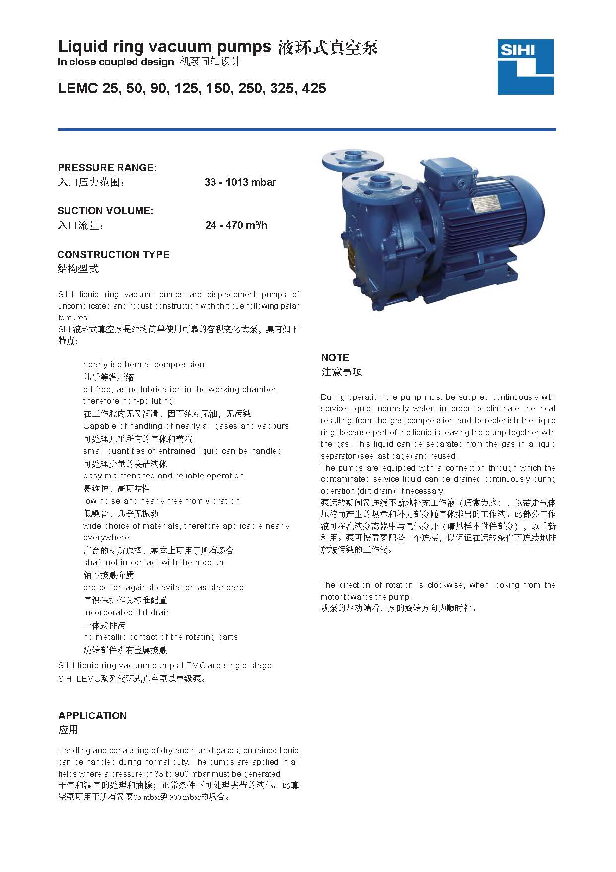 LEMC系列液环真空泵包括以下型号:LEMC25,LEMC50,LEMC90,LEMC125,LEMC150,LEMC250,LEMC325,LEMC425等