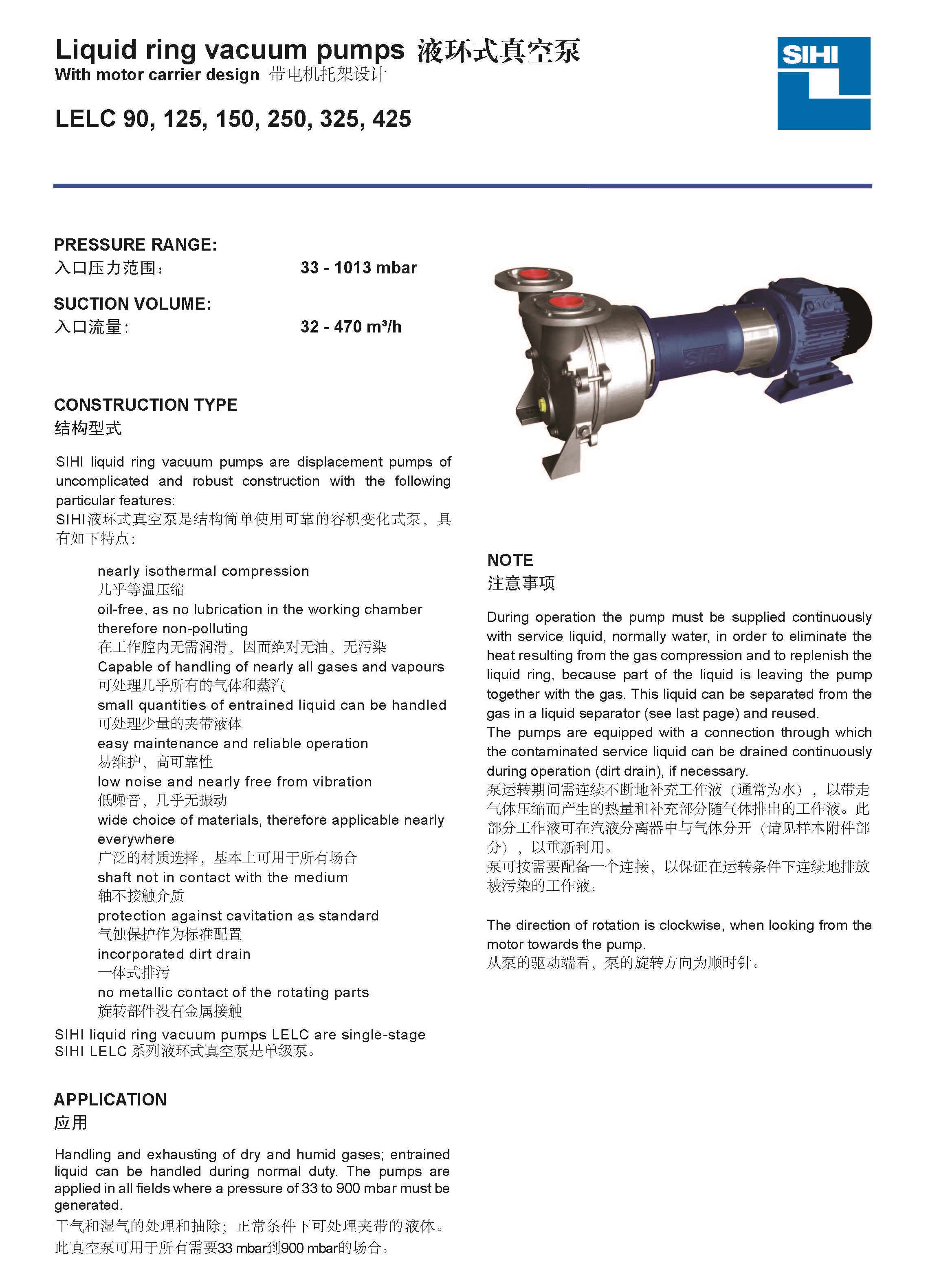 SIHI液环式真空泵是结构简单使用可靠的容积变化式泵。LELC系列液环真空泵包含以下型号:LELC90,LELC125,LELC150,LELC250,LELC325,LELC425等。